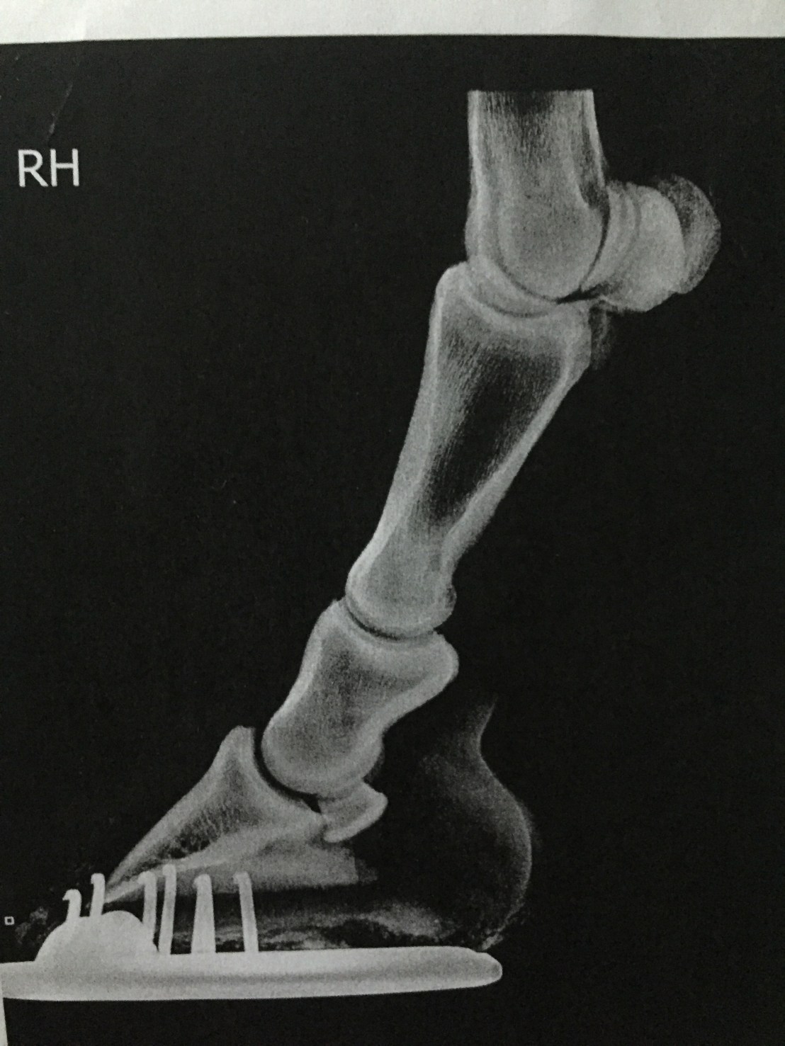 Frank has been on the sick now for two months. Initially he presented with a really sore back back, shoulder and hamstring. I have no idea how he has done this. Two days before the wheel fell off, we came second on a 1m showjumping class -just two seconds behind the winner. This effort was followed by a day off (field turnout) and a steady hack on the second day. On the third day towards the end of a flatwork session practising a couple of Novice tests someone notices his saddle is lifting off his back. Shortly after this Frank stops and cow kicks his belly as if trying to remove a pesky fly and then refuses to move forward- it was like trying to push a wonky shopping trolley. Since he won’t go forward and something is clearly bothering him I dismount feeling sure that there is something wrong with the dressage saddle. I turn him out and Frank has a good roll in the mud and a gallop round the field bucking with glee at being set free. Hmmmmm? he doesn’t look that much in pain does he? Next day he has a day off and on Saturday we box up to a yard with a solarium. He’s still in discomfort Saturday afternoon so we have no choice but to withdraw from Sundays dressage competition and I feel like my world is capsizing. Ten days after Frank’s initial symptoms appeared he has a two hour appointment with Imogen Gifford, physiotherapist. Deep tissue massage, ultrasound and laser therapy to back muscles which appear hard and unyielding. Tuesday appointment with Bethan Lloyd who found similar soreness and realigns a rib. By Friday 25 January he’s no better. The following Monday I make an appointment with Cotts Wednesday 30. As he is trotted up , slight unevenness behind is noted. Lunging in the round pens makes this more obvious. Investigation of hind limb lameness blocked to the left stifle and Frank was prescribed previcox 57mg/day for 30 days then half a tablet for 20 days. Xrays of feet and hocks show no arthritic or bony changes. Both hind xrays show broken back between pedal bone and short pastern – this is being remedied by my farrier who was now able to see exactly what was going on.